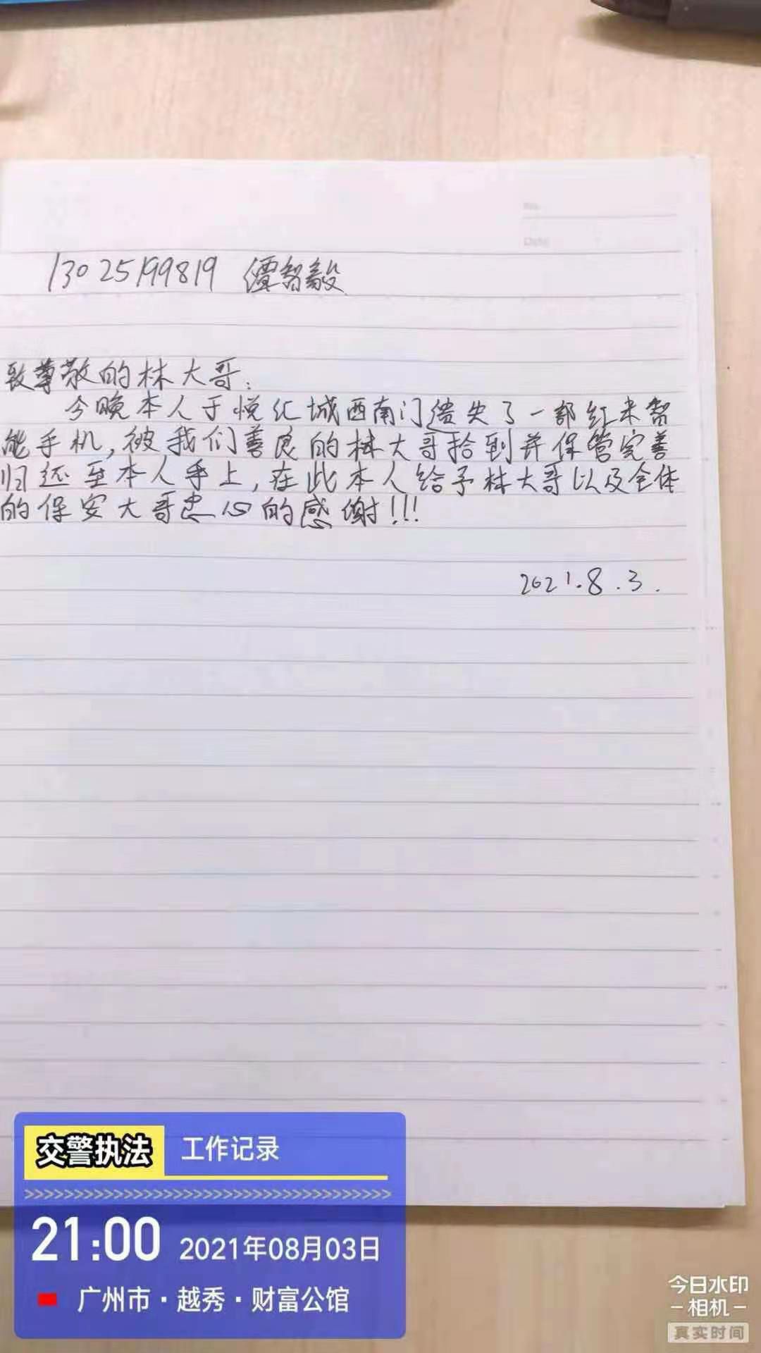 2021年8月3日,球盟会网页版页面登录-球盟会(中国)驻西村悦汇城保安员林伟强像往常一样准备交接岗,当走至负一西南门门口的时候发现地上有一部黑色智能手机,林伟强在现场等待失主并上报了当班值班经理,不一会儿失主打电话过来,核实了失主身份后将失物归还。失主十分感动,并现场手写感谢信一封以表谢意。